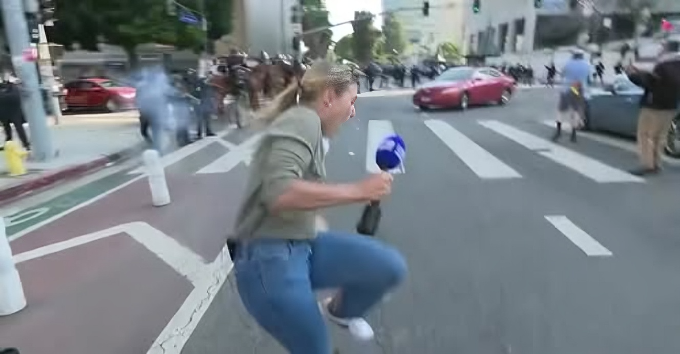 Journalisten Lauren Tomasi från autralienska Nine News var mitt i livesändning utanför Metropolitan Detention Center i Los Angeles när en polis sköt henne med gummikula. Hon var där för att rapportera om för att rapportera om protesterna mot migrationsmyndighetern ICE:s räder mot immigranter och det var polis i kravallutrustning som sköt henne.