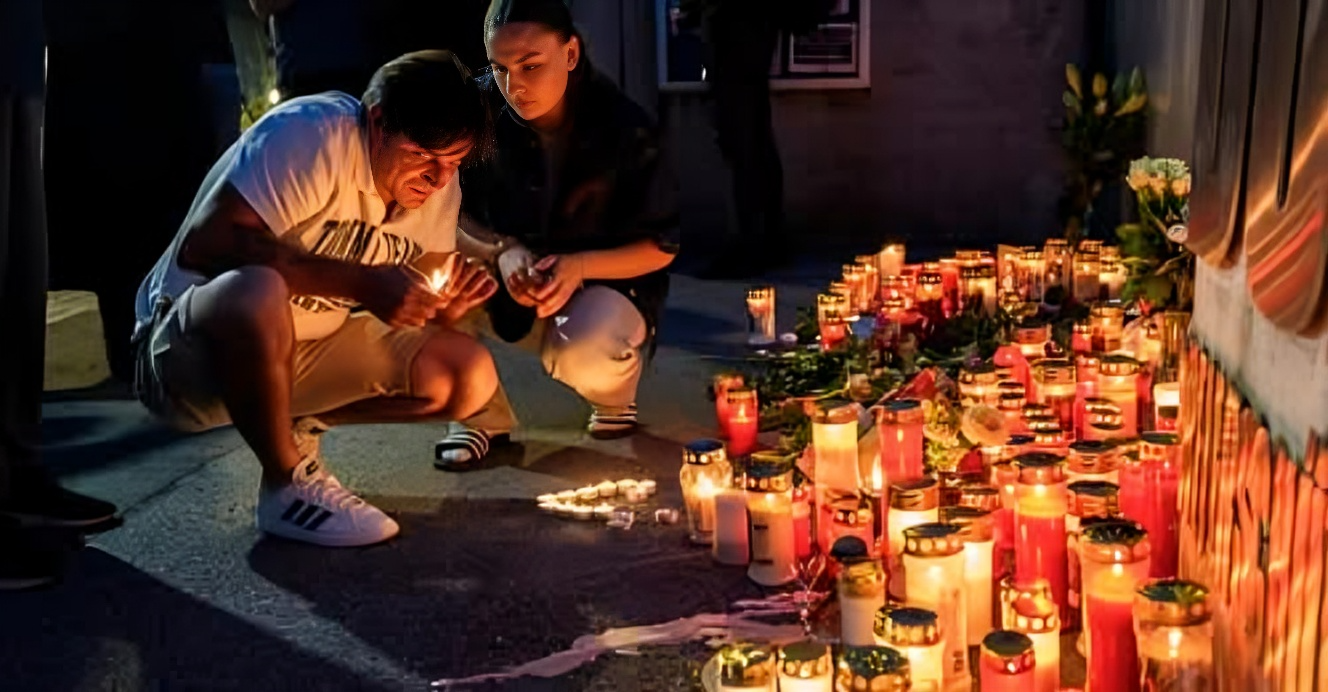 En banderoll med orden ”Graz står tillsammans” hänger på skolstaketet. Nedanför ligger sjukvårdsmateriel fortfarande kvar i en hög – en påminnelse om det fruktansvärda som utspelat sig på platsen bara några timmar tidigare.