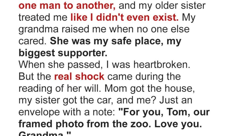 It was a framed photograph: Grandma and me at the zoo when I was six. My hair hung in crooked pigtails, my face half-sticky from ice cream. A giraffe bent toward us, its long lashes brushing the top of my head. Grandma held my hand like she always did—steady, warm, unbothered by anything around her. That was it. No check. No sentimental jewelry. Just a picture in a wooden frame with one corner cracked.