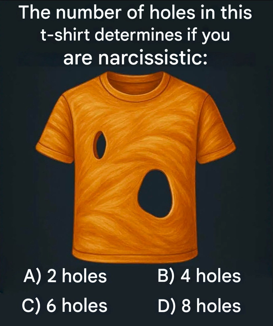 Imagine a bright orange t-shirt lying in front of you, with two large tears across the front. Below, four possible choices: 2, 4, 6, or 8 holes. And a title that piques curiosity: “The number of holes you see on this t-shirt reveals if you are a narcissist.” That’s quite a claim! Before drawing any psychological conclusions, let’s take it for what it truly is: a fun little visual puzzle, perfect for testing our thinking skills (and for sharing freely on WhatsApp or over coffee).